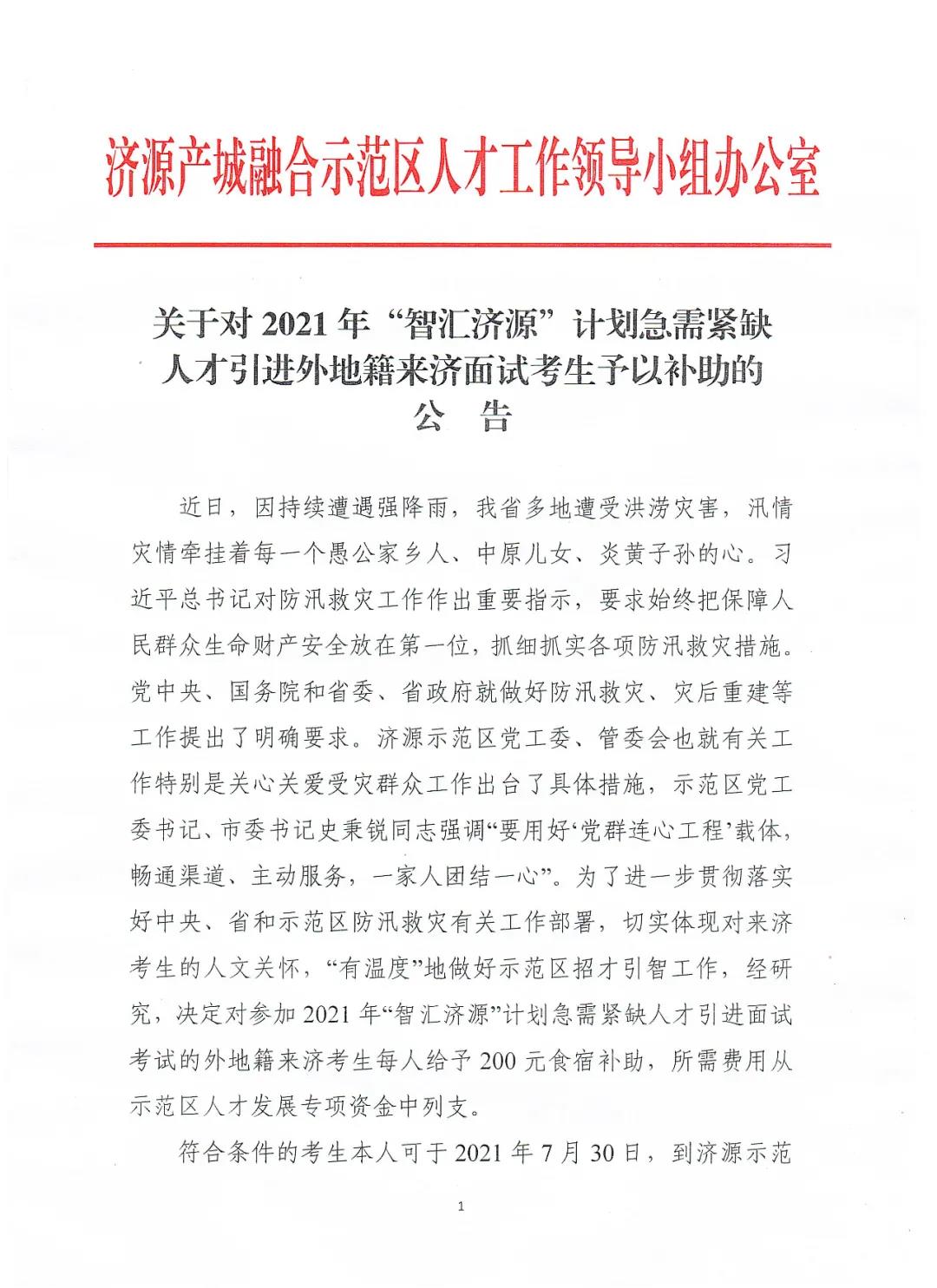 2021年“智汇济源”人才引进外地来济面试考生补助公告