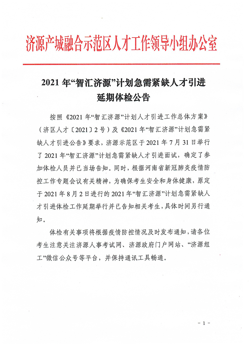 2021年“智汇济源”计划急需紧缺人才引进延期体检公告