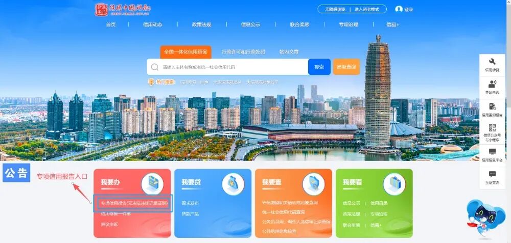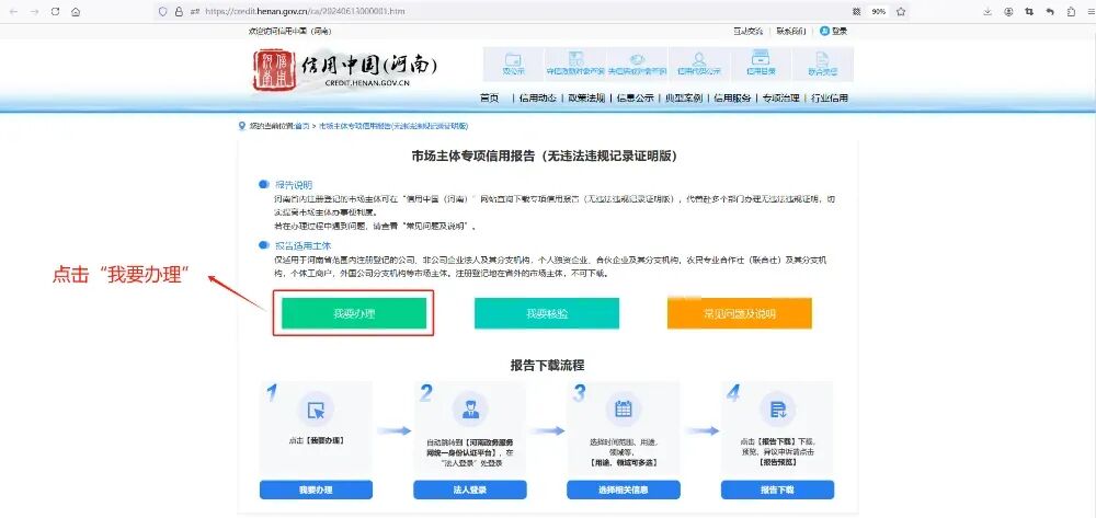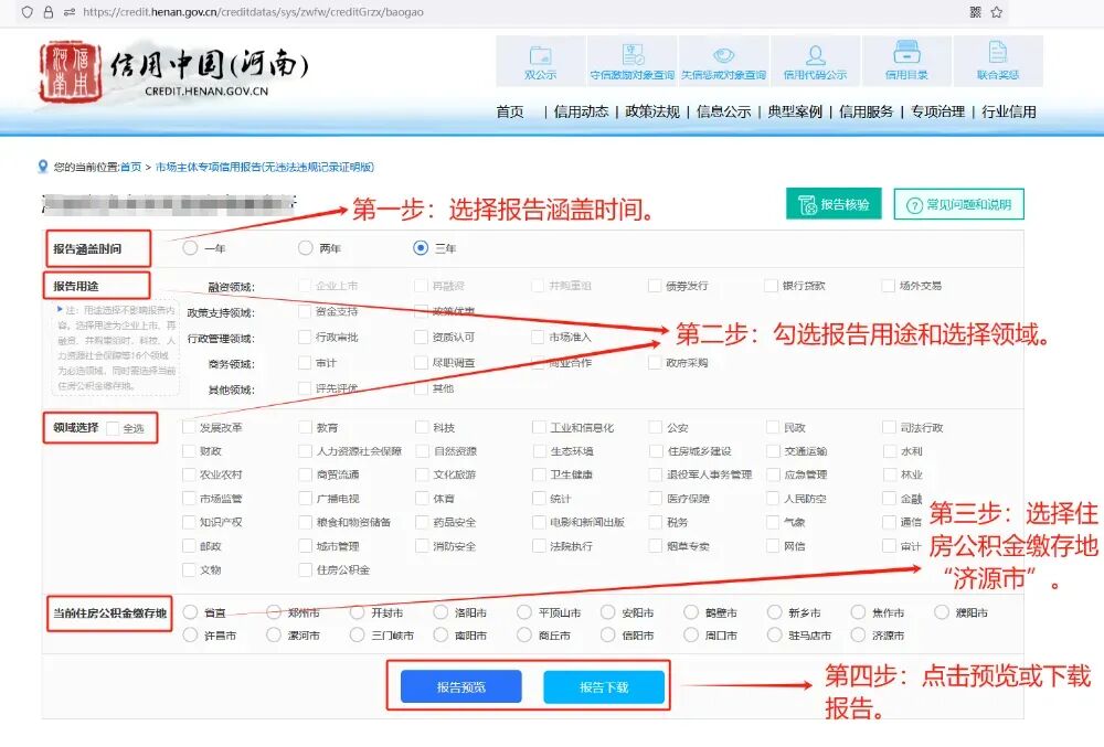 河南省内注册登记的市场主体可在“信用中国(河南)”网站查询下载专项信用报告(无违法违规记录证明版),代替赴多个部门办理无违法违规记录证明,切实提高市场主体办事便利度。一、替代领域:包括发展改革、教育、科技、工业和信息化、公安、民政、司法行政、财政、人力资源社会保障、自然资源、生态环境、住房城乡建设、交通运输、水利、农业农村、商贸流通(商务)、文化和旅游、卫生健康、退役军人事务管理、应急管理(安全生产)、林业、市场监管、广播电视、体育、统计、医疗保障、人民防空、金融(地方金融监管)、知识产权、粮食和物资储备、药品安全、电影新闻出版、税务、气象、通信、邮政、城市管理、消防安全、法院执行、烟草专卖、网信、审计、文物、住房公积金、密码管理、档案、地震等,共计47个领域。市场主体可根据报告应用场景或相关主管部门的要求自行选定所需要的领域,可多选。二、适用场景:企业上市、再融资、并购重组、债券发行、银行贷款、场外交易等融资领域;资金支持、政策优惠等政策支持领域;行政审批、资质认可、市场准入、项目申报等行政管理领域;审计、尽职调查、商业合作、政府采购、公共资源交易等商务领域;评先评优等其他适用领域。三、适用主体:仅适用于河南省范围内注册登记的公司、非公司企业法人及其分支机构,个人独资企业、合伙企业及其分支机构,农民专业合作社(联合社)及其分支机构,个体工商户,外国公司分支机构等市场主体。注册登记地在省外的市场主体,不可下载。四、下载途径:市场主体登录“信用中国(河南)”网站、河南政务服务网,完成统一身份认证后,查询、下载专项信用报告电子版。1、登录信用中国(河南)(credit.henan.gov.cn)网站,点击市场主体专项信用报告无违法违规记录证明版。2、点击我要办理,完成统一身份认证后,选择时间范围、用途、领域等,点击报告下载。